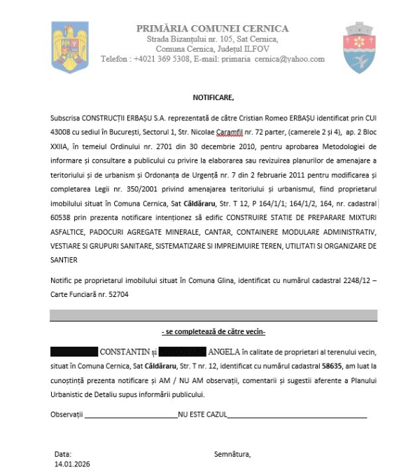Subscrisa CONSTRUCȚII ERBAȘU S.A. identificata prin CUI 43008 cu sediul în București, Sectorul 1, Str. Nicolae Caramfil nr. 72 parter, (camerele 2 și 4), ap. 2 Bloc XXIIA, în temeiul Ordinului nr. 2701 din 30 decembrie 2010, pentru aprobarea Metodologiei de informare și consultare a publicului cu privire la elaborarea sau revizuirea planurilor de amenajare a teritoriului și de urbanism și Ordonanța de Urgență nr. 7 din 2 februarie 2011 pentru modificarea și completarea Legii nr. 350/2001 privind amenajarea teritoriului și urbanismul, fiind proprietarul imobilului situat în Comuna Cernica, Sat Căldăraru, Str. T 12, P 164/1/1; 164/1/2, 164, nr. cadastral 60538 prin prezenta notificare intenționez să edific CONSTRUIRE STATIE DE PREPARARE MIXTURI ASFALTICE, PADOCURI AGREGATE MINERALE, CANTAR, CONTAINERE MODULARE ADMINISTRATIV, VESTIARE SI GRUPURI SANITARE, SISTEMATIZARE SI IMPREJMUIRE TEREN, UTILITATI SI ORGANIZARE DE SANTIER Notific pe proprietarul imobilului situat în Comuna Glina, identificat cu numărul cadastral 2248/12 – Carte Funciară nr. 52704