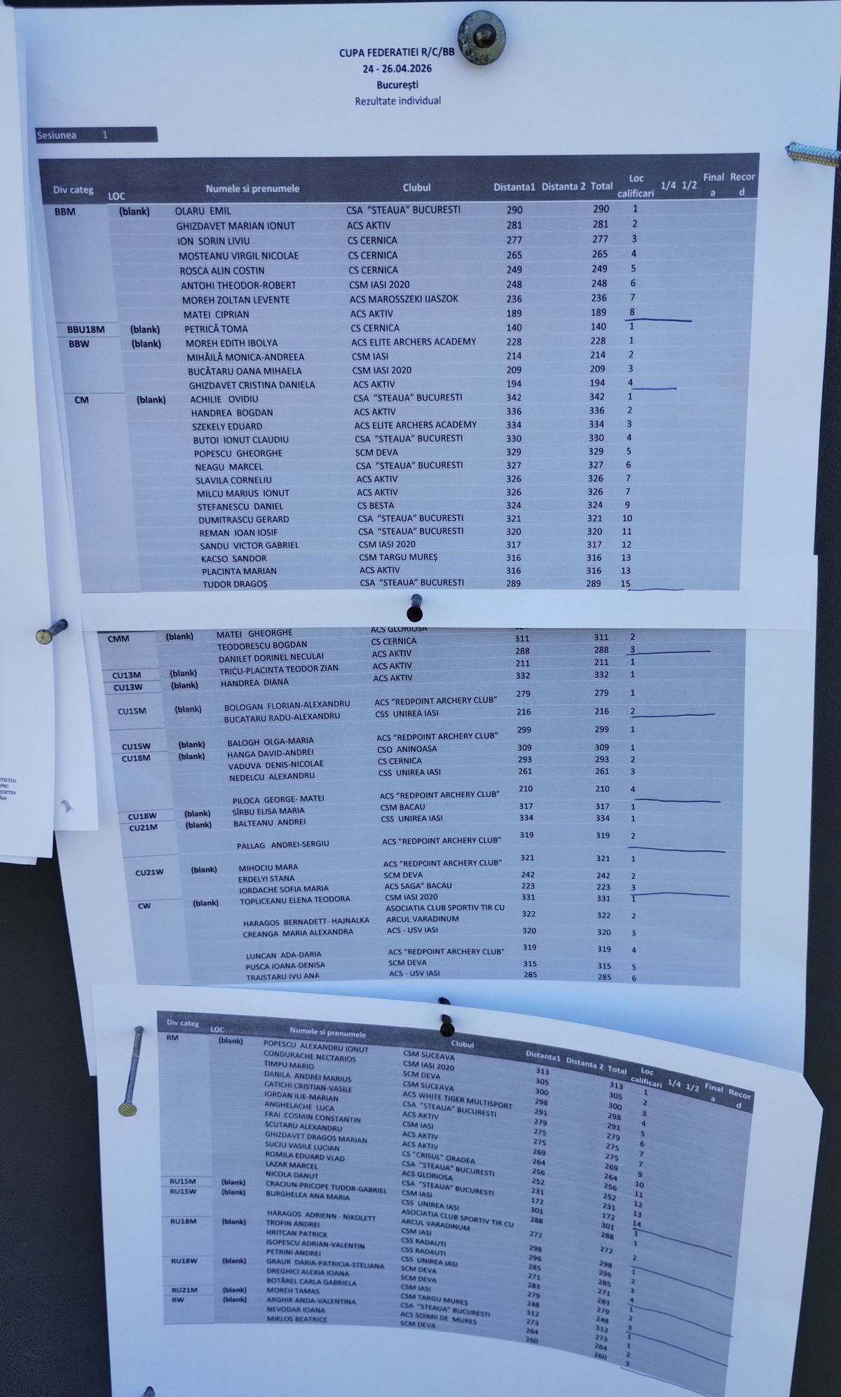 Rezultate concurs: rezultate individuale, clasament pe cluburi si rezultate pe divizii: